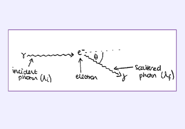 The Compton effect occurs when an incident photon interacts with an outer shell electron. The photon is scattered by the electron and the electron is excited by the photon. The energy of the photon after the interaction is dependent on the angle of scatter. The change in wavelength of the electron, ∆𝜆𝜆, can be calculated using Planck’s constant, ℎ, the mass of an electron, 𝑚𝑚, and the speed of light, 𝑐,